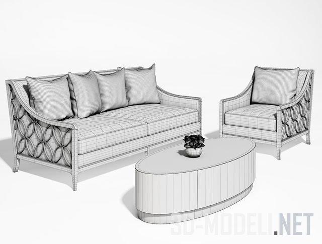 Диван UPH-SOFWOO-62B, кресло UPH-CHALOU-02D и овальный столик CON-COCTAB-031 от Caracole. Рама и каркас дивана и кресла изготовлены из золотистого металла. Из такого же материала и цоколь белого стола. Обивка кресла и дивана - сливочного цвета кожа. Диванные подушки бледно-золотистые.