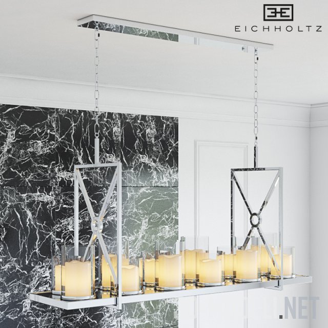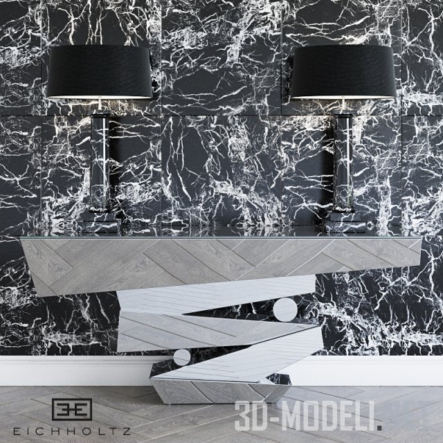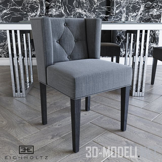 Комплект мебели с большим столом для современного классического интерьера от Eichholtz. Элегантные элементы в конструкции оригинальной консоли, на ножках светильников, люстры и стола отделаны зеркальным материалом, создавая восхитительные иллюзии. А черные ножки стульев, черные абажуры светильников, темно-серая обивка спинок и сидений на стульях, черный с белым мрамор на декоративной вставке стены, лишь подчеркивают строгость интерьера.