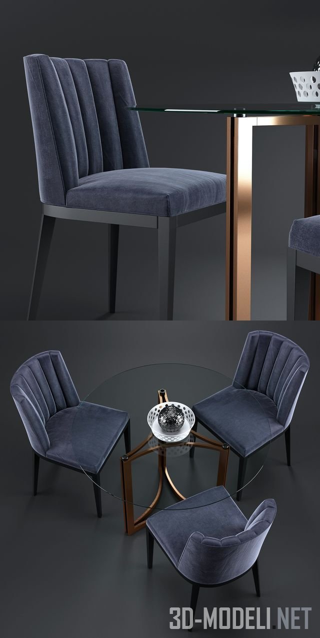 Черные рамы и ножки стульев отлично гармонируют с сине-серой плюшевой обивкой сидений и спинок. Спинка декорирована вертикальной строчкой. Сложная подставка стола из светлого дерева создает трехгранную основу с гнутыми элементами. На столе - белая ваза для фруктов и серебристый декоративный шар.