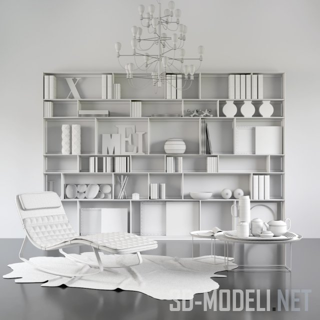 Набор мебели и интерьерных элементов, в основе которой современный стеллаж с декором и шезлонг Landcsape (дизайн Jeffrey Bernett для B&B Italia). Проекты Джеффри Бернетта отражают его поиск гармоничных форм, приверженность функциональности и простоте объектов, а также внимание к деталям. И этот шезлонг – наиболее элегантное выражение баланса между формой и комфортом. Воздушное сиденье маневренное и привлекательно удобное, с минималистичным дизайном, придающим шезлонгу очень легкий вид. Чехол сшивается сегментами, может быть из ткани или кожи (он полностью съемный). Для повышения уровня комфорта шезлонг имеет регулируемый подголовник, который можно расположить по желанию.