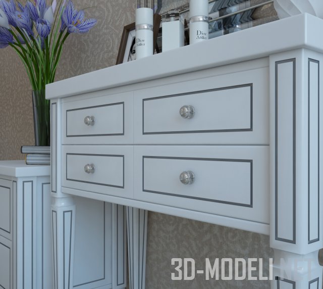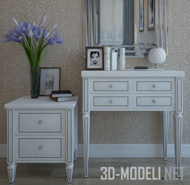 Тумбочка белого цвета из массива бука в классическом стиле с двумя выдвижными ящиками и белый консольный столик в таком же стиле, с четырьмя выдвижными ящиками формируют набор мебели для спальни KAVELIO. Мебель отделана узким матовым серебристым декором, что придает ей очень элегантный вид.