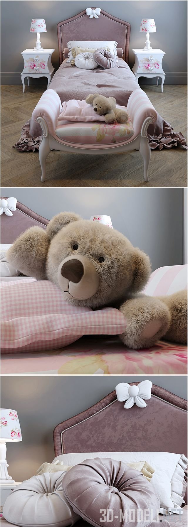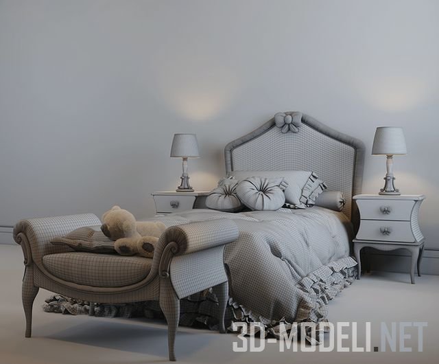 Романтичная мебель для спальни , содержит кровать «Monnalisa Vivienne» (1200 x 1900 x 1250), прикроватный столик «Monnalisa Colette» (размер 450 x 360 x 590), настольную лампу Monnalisa Petit Eloide (размер светильника 250 x 250 x 480), банкетку «Monnalisa Camille». Размер банкетки: 930 х 510 х 540. Мягкая игрушка сделана с помощью Hair & Fur.