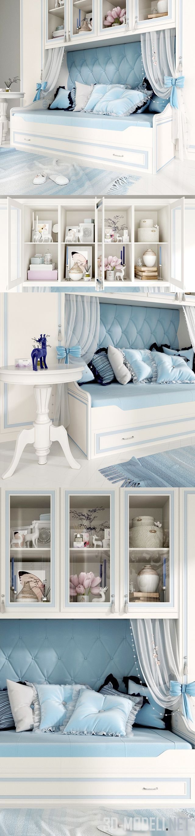 Романтичная мебель для детской комнаты, Collection Happy-Night от бренда Ferretti e Ferretti (Composition 303). Отделка в цвете N02 GLAZED WHITE WITH BLUE COLOR WASH. Набор содержит кровать (2500 x 1150 x H 3100 мм), мебель для хранения вещей (шкаф, полки), кофейный столик, а также множество интерьерных аксессуаров и предметов декора (подушки, шторы, тапочки, коврик, свечи, фоторамки, ящики для хранения, вазы, цветы, книги и пр.)