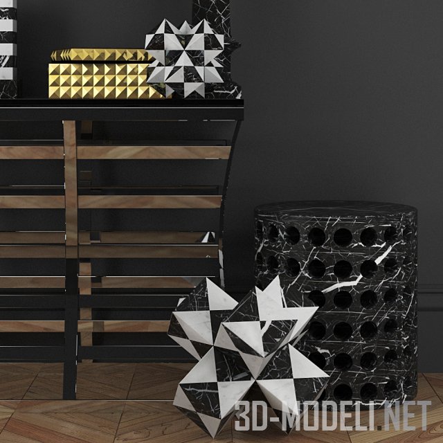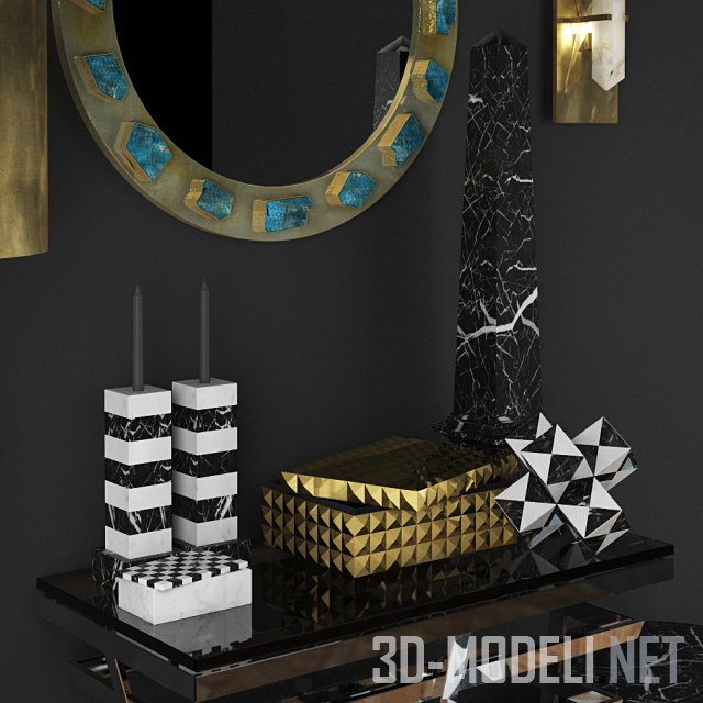 Композиция из мебели и декора от брендов Eichholtz & Kelly Wearstler. В наборе Консоль Eichholtz, стол Barolo, приставной столик Kelly Wearstler, круглое зеркало Weastler Bejeweled в бронзовой раме с декором из крупных голубых кристаллов, прямоугольный бра Weastler Halcyon, свеча Memsticks, коробка Eichholtz, сумка Vivienne S, декоративный черно-белый обелиск Weastler Miniи и декор Salinas.