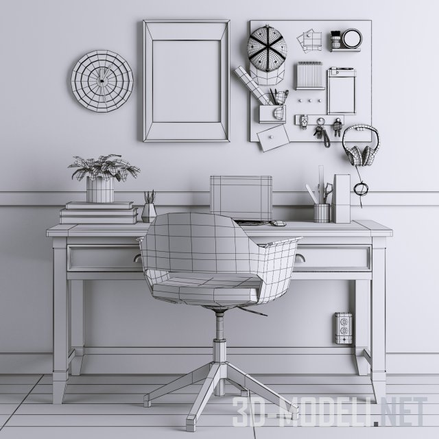 Современная мебель от IKEA и различные аксессуары для формирования рабочего места в комнате. В наборе письменный белый стол со столешницей из светлого дерева, кресло, спинка и подлокотники которого изготовлены из цельного куска гнутой фанеры. Присутствует квадратная настенная доска с полками и вешалками для мелочей, а также многочисленные аксессуары (настенные круглые белые часы, панно с абстрактным рисунком, ноутбук на столе, органайзер, книги, горшок с цветами) и пр.