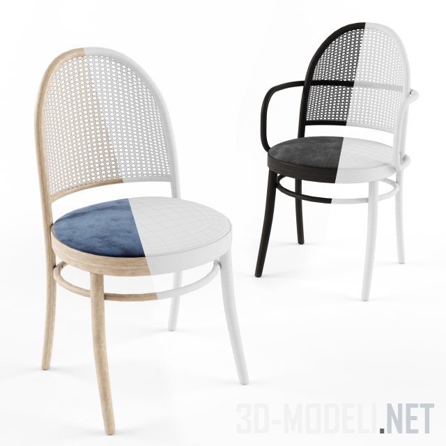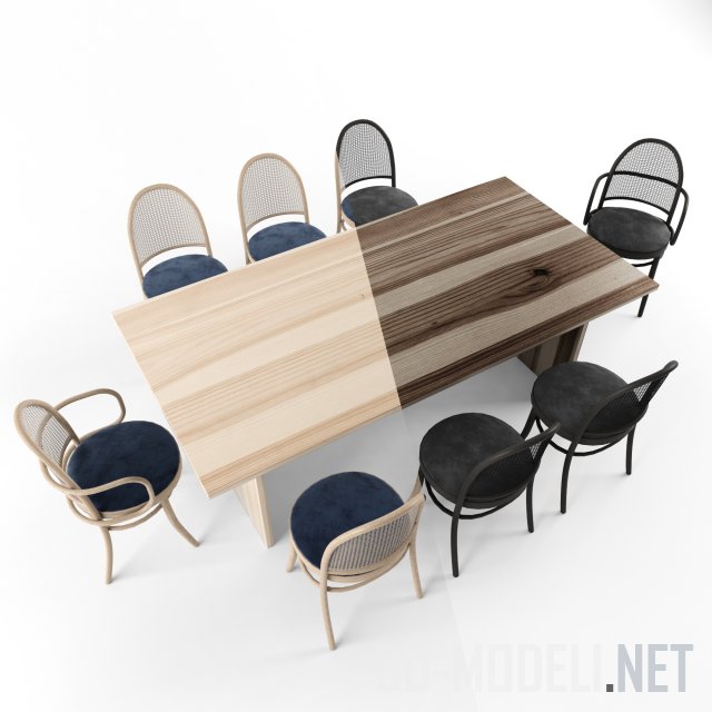 Комплект обеденной мебели: шесть стульев и прямоугольный деревянный стол. Спинки стульев сделаны в виде деревянных арок, заполненных сеткой в цвет древесины каркаса стула. Представлено два варианта мебельного гарнитура: стол из светлого дерева со стульями, сочетающими светлое дерево и синюю бархатную обивку мягкого сиденья. И стол темного дерева, с контрастной текстурой зебрано, темными стульями и графитово-серой обивкой сидений.