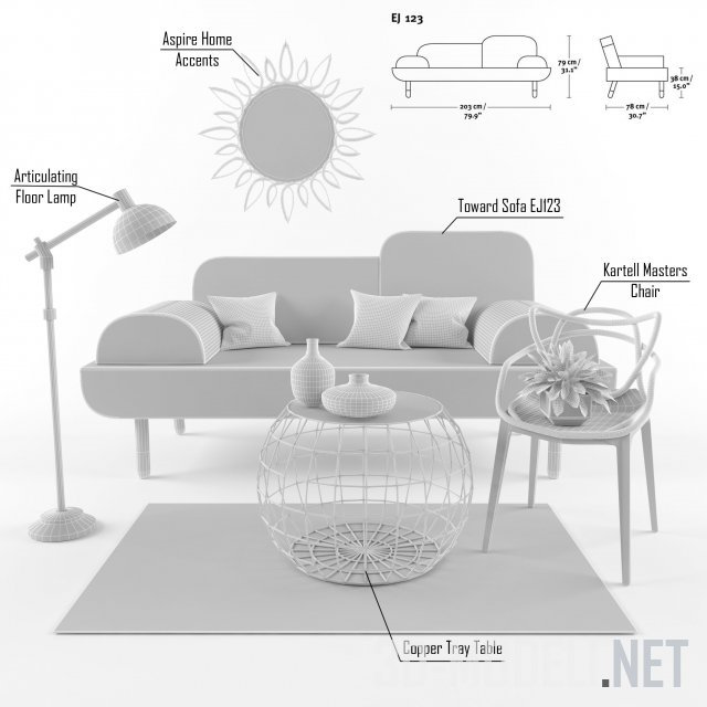 Романтичный, нежный комплект мебели и декора. В основе диван с розовой обивкой, дополнен декоративными подушками. Стульчик с цветком, оригинальный журнальный стол, торшер, зеркало и ковер создают гармоничный, современный ансамбль.