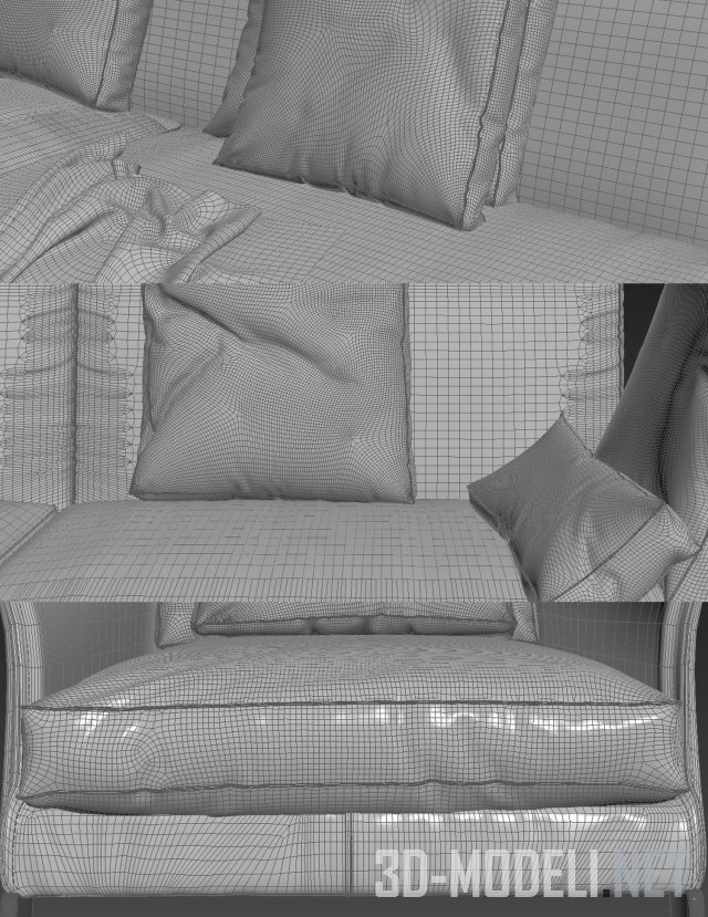 Набор современной мебели от бренда Flexform. В комплекте модульный диван Evergreen серого цвета с серыми и черными подушками и коричневым пледом, свисающим на пол с сиденья, коричневое кожаное кресло Boss с черной подушкой и приставной столик Gipsy с коричневой столешницей. На столике находятся книги, плоская ваза и лампа Vibia I.Cono черного цвета.