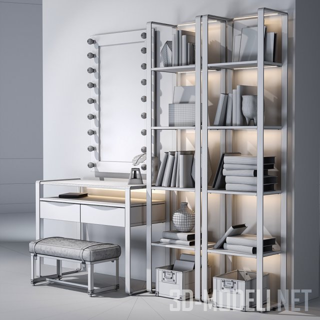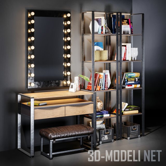 Современная мебель индивидуального производства для интерьера в стиле LOFT. В наборе консольный стол из светлого дерева на прямых металлических ножках (1190 x 550 x 920 см), прямоугольное зеркало (810 x 1310 см) с рядом лампочек по периметру рамы, два высоких металлических стеллажа размером 570 x 350 x 2300 см с декоративными предметами на полках и кожаная банкетка 820 x 410 x 420 см.
