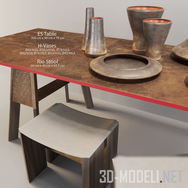 Комплект для современной гостиной, в который входит стол, стул, подвесной светильник и декоративные вазы. Подробней: