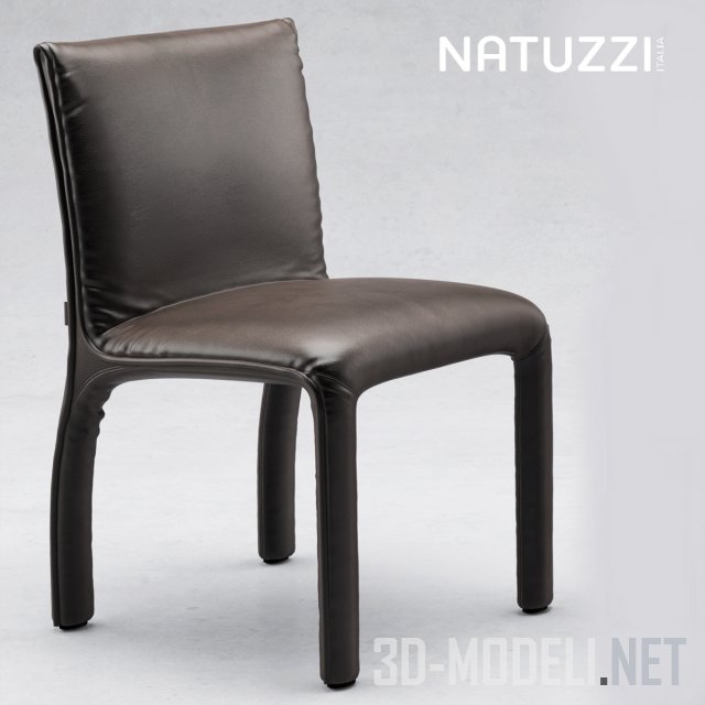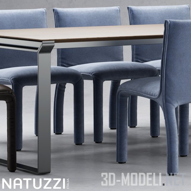 Мебельный сет от бренда Natuzzi производства Италия. В основе прямоугольный стол с коричневой столешницей на матовом металлическом основании. Возле стола стоят мягкие стулья голубовато-серого цвета. Оригинальной отличительной особенностью стульев является то, что они полностью вместе с ножками обтянуты тканью или кожей.