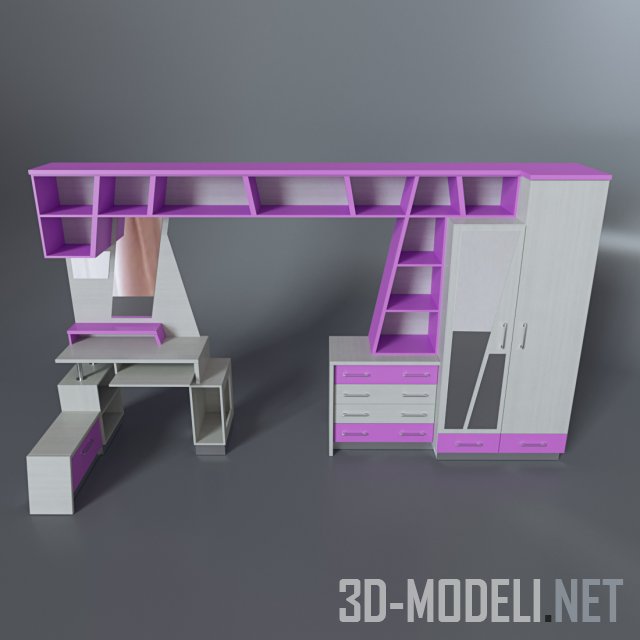 Комфортная деревянная мебель. Большое количество полок позволяет максимально освободить пространство вокруг. Также есть специальное место для компьютера и шкаф для вещей. Мебель в серо-сиреневых тонах, отлично подойдет для детской комнаты.