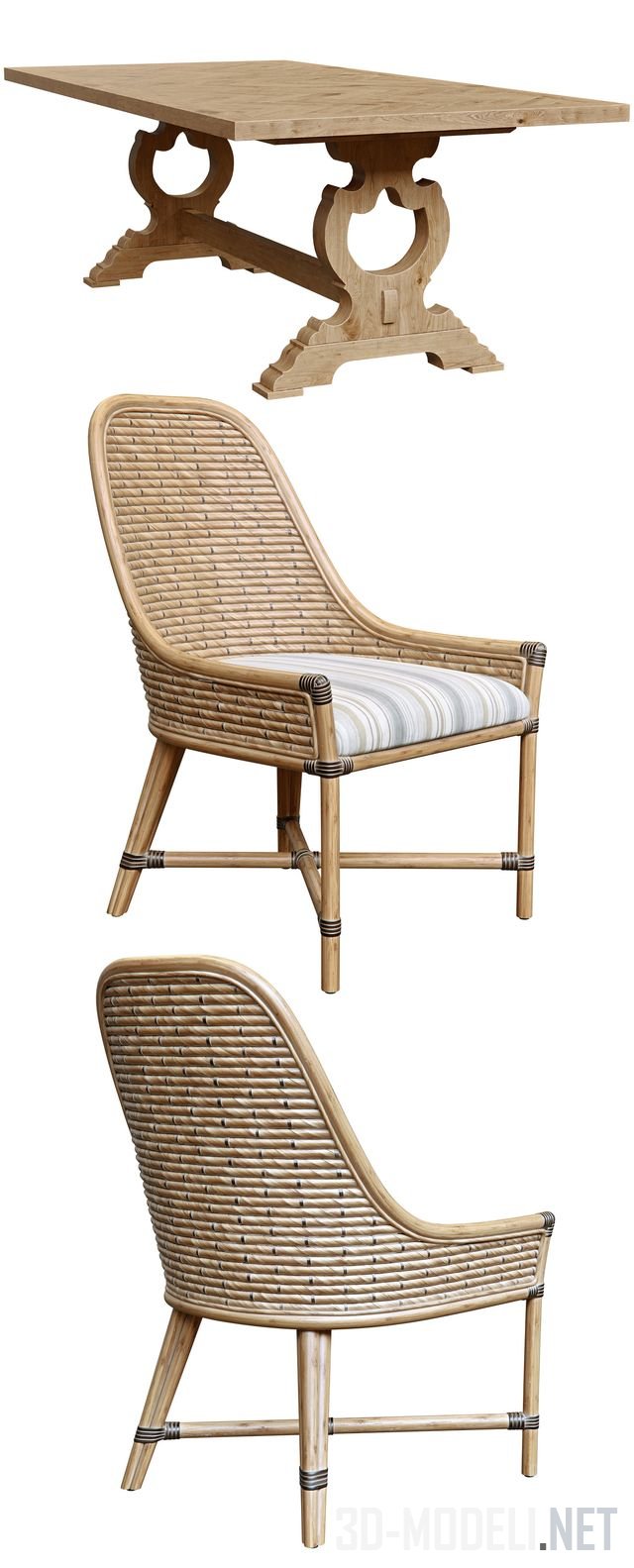 Набор обеденной мебели. Ротанговые рамы боковых стульев Keeling подчеркнуты скрученным банановым листом, обвязанным кожаной лентой. Можно выбрать ткань или кожу для подушки сиденья (за дополнительную плату). Прямоугольный обеденный стол на козлах с диагональю 88 дюймов станет идеальным местом для встреч. Столешница украшена элегантным рисунком из шпона «елочкой», а с двумя створками стол расширяется до 132 дюймов, что позволяет комфортно разместить десять человек.