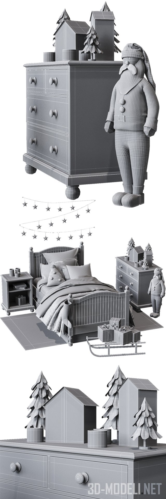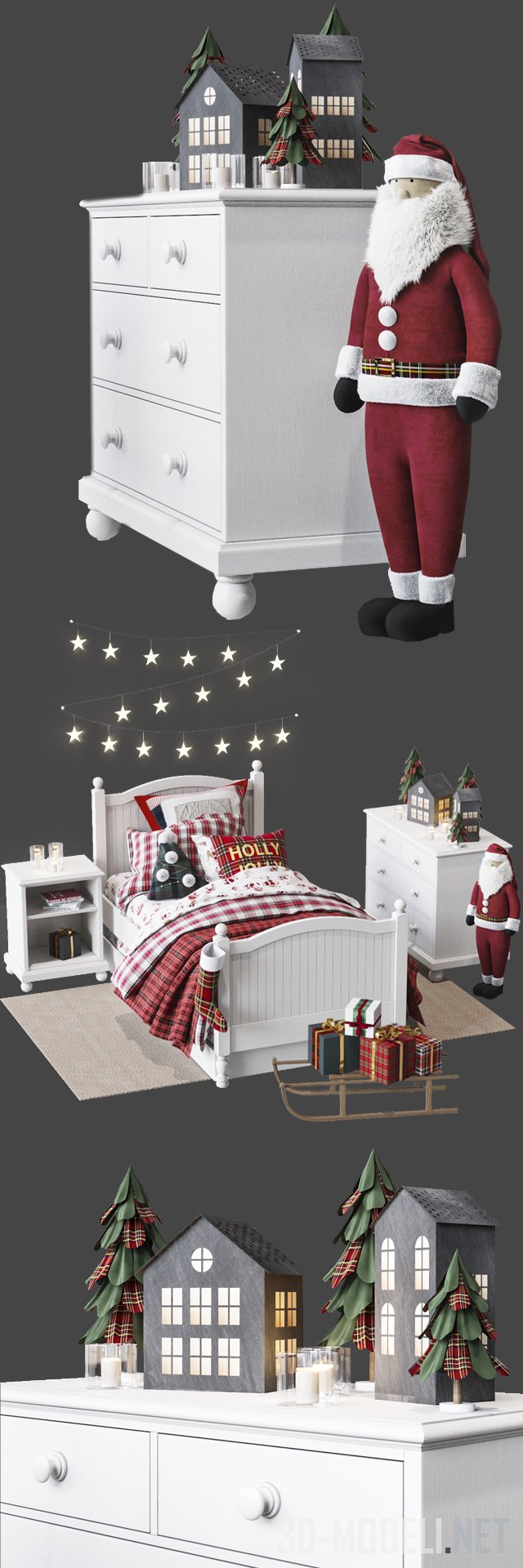 Мебельный сет Catalina от бренда Pottery Barn, комплект в рождественском стиле. В наборе белая деревянная кроватка с уютным постельным бельем в красную и белую клетку, гирлянда на стене из светящихся звездочек, тумбочка, белый комод, на котором стоят игрушечные домики и рождественские елочки, большая фигура Санта-Клауса и санки с коробками подарков.