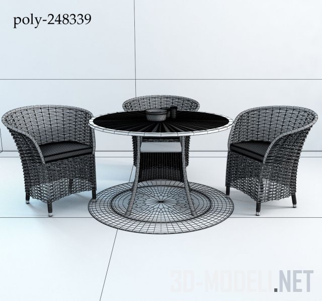 Набор плетеной из ротанга мебели Patio Wicker, светло-коричневого цвета. Набор состоит из изящного столика с круглой столешницей и трех кресел. Кресла имеют полукруглую спинку, переходящую в подлокотники и мягкие белые прямоугольные подушки на сиденье.