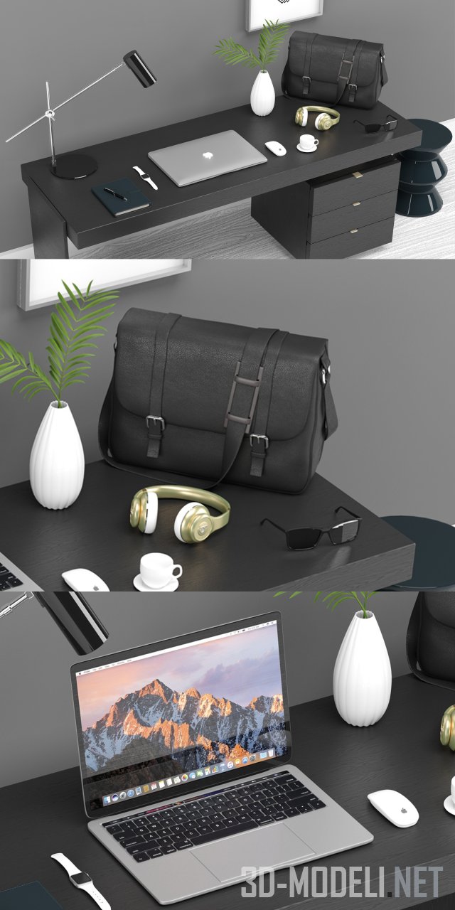 Стильное современное рабочее место от итальянского бренда Minotti, модель Carson. На письменном столе Carson цвета графит находится минималистичная настольная лампа,  открытый ноутбук Apple Watch, ваза с зеленью, сумка и лежат наушники beats. Возле стола стоит мягкое рабочее кресло, обтянутое кожей графитового цвета.