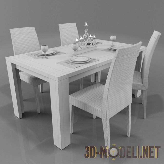 3D-модель набора мебели Perfecta Ivory. Итальянская мебель для гостиной, в которую входит обеденный стол Perfecta Ivory, прямоугольный, с лакированной столешницей. Артикул – PEDIVTA01, размеры W160 x 90 h75, и стул Perfecta Ivory с мягкой спинкой. Обивка – микрофибра серого цвета. Артикул PEDIVSD01, габариты - W45 x 45 h101. Также в сцене находится подсвечник «Вензель», ПЧ-0500200-БЛ-ПС. Все текстуры в архиве.