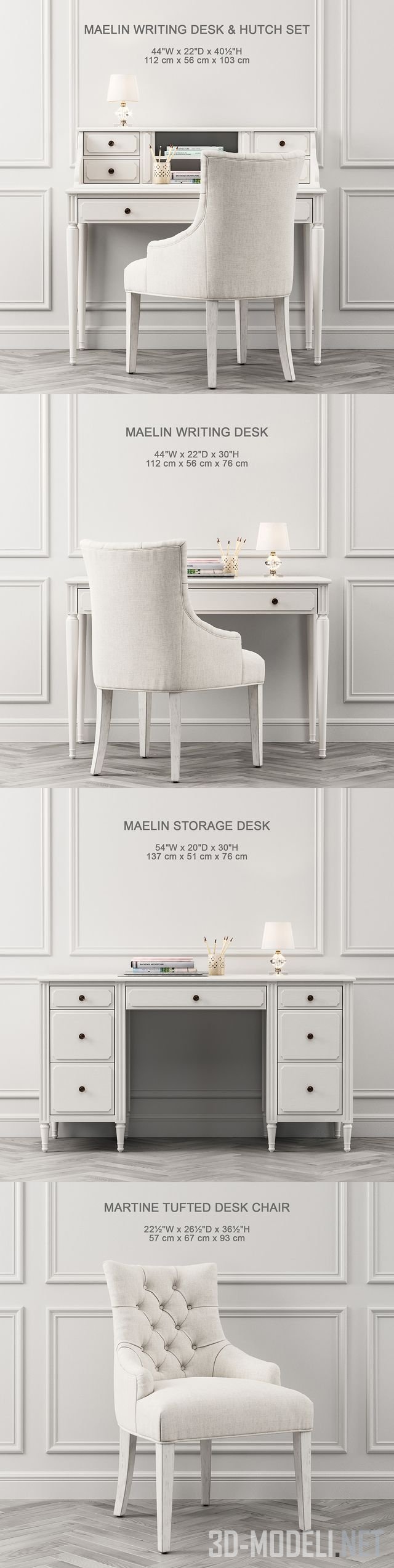 Изящный мебельный сет из дерева белого цвета, серия Maelin от Restoration Hardware Teen. В сет входят два письменных стола размерами: 112 см х 56 см х 76 см и 112 см х 56 см х 103 см, стол для хранения 137 см х 51 см х 76с м, стул MARTINE TUFTED размером 57 см х 67 см х 93 см, открытая тумбочка 56 см х 43 см х 70 см, тумба с тремя ящиками 56 см х 43 см х 70 см, два комода: 107 см х 51 см х 91 см и 142 см х 51 см х 91 см, два книжных шкафа: 99 см х 38 см х 150 см и 66 см х 38 см х 173 см. А также настольная лампа GRACE CRYSTAL с белым абажуром.