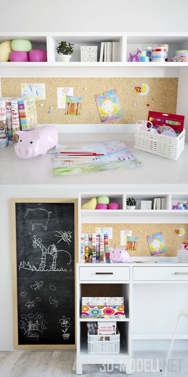 Эргономичный и красивый набор мебели для интерьера детской комнаты, с наполнением. Это книги, декор, хрюшка, карандаши, коробки, корзина, меловая доска, ленты, нитки. Полы - дуб century. Стол и стул белого цвета.