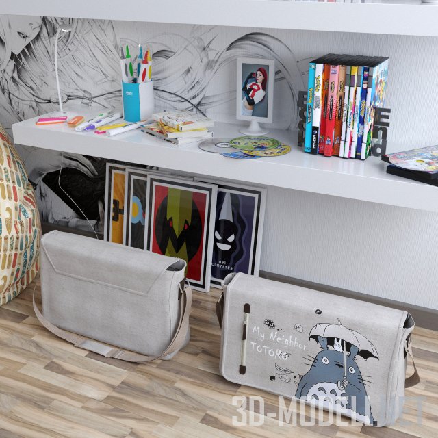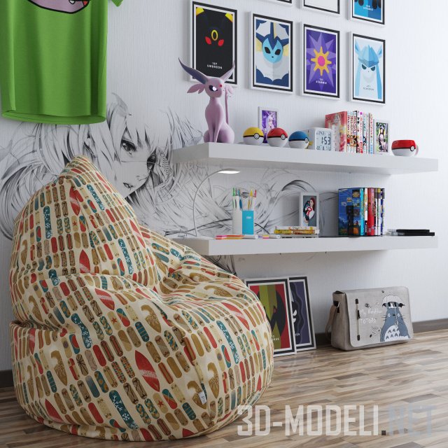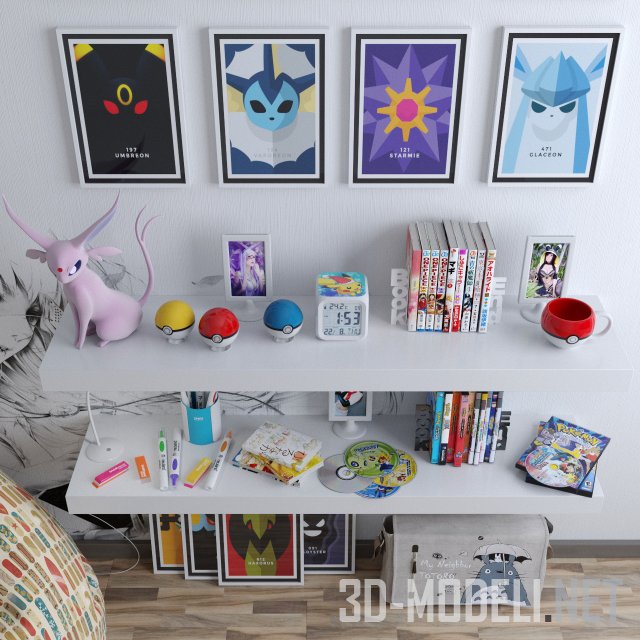 Набор мебели и декоративных предметов для интерьера детской, в стилистике аниме. Сет содержит постеры иллюстратора Daniel Stanley, игрушку покемон «Aspeon», полки LAKK IKEA, рамки для постеров STROMBY IKEA, фоторамки TOLSBY IKEA, настольный светильник CALPO 1 93891, маркеры Neuland и пр.