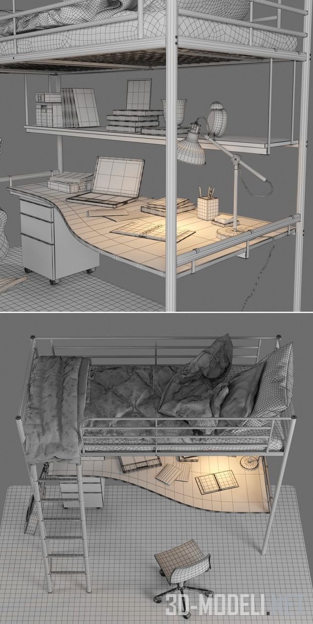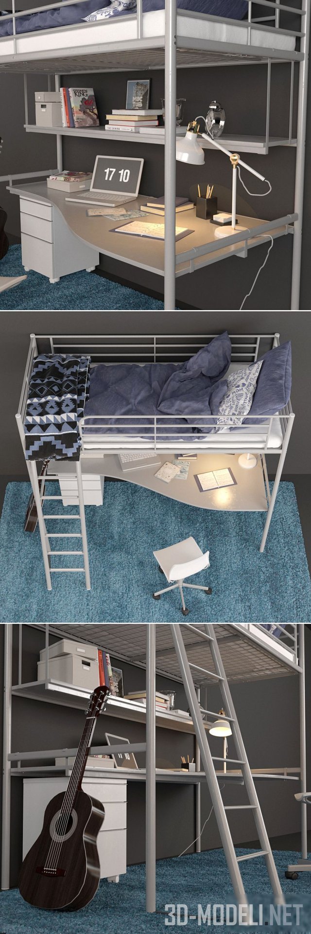 Мебельная группа Svarta для детской спальни от IKEA. В первом ярусе конструкторы разместили письменный стол с тумбой БЕСТО БУРС из белой и светло-серой плиты. На столешнице ноутбук, письменные принадлежности, настольный светильник РАНАРП. Второй ярус - книжная полка с коробками, книгами, будильником. Третий ярус конструкции - спальное место СВЭРТА с белым матрасом и лавандовым комплектом постельного белья. Основа конструкции и лесенка к спальному месту - каркас из металлических труб, выкрашенных в светло-серый цвет. В сцену включен прямоугольный коврик серо-голубого цвета, кресло СНИЛЛЕ на колесиках, гитара.