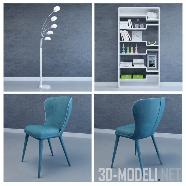 Набор современной мебели KARE для офиса, кабинета, детской комнаты. В наборе: шкаф с открытыми полками (KARE Soft Shelf White арт.74318), письменный стол (KARE desk solution арт.76215), стул (KARE Santorini Light Blue арт.80667), настенные полки (KARE Wall Rack Lounge арт.75831), светильник напольный (KARE five fingers арт.3438). Основной тон мебели - белый. Стул - голубой. На полках шкафа: рамка (KARE NY Skyline арт.34295), статуэтка из металла в виде вишен (Deco Objekt Cherry арт.36748), ваза (Mushroom Blue арт.35663), чаша, квадратные часы (Wall Clock Fila арт.38855), подсвечники четырех пастельных оттенков (Pastel Fusil арт.34568).