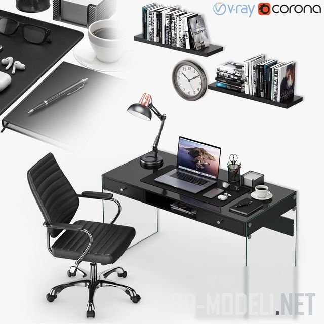 Стильное и современное рабочее место (стол, стул, техника, декор). В комплект входят MacBook Pro 16, iPhone 11 pro MAX, AirPods Pro, настольная лампа Arte Lamp Luxo, настенные часы Ikea Sondrum, письменный стол Coaster Dobrev 2, книги, очки, ручка Parker, ежедневник, чашка кофе.