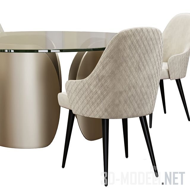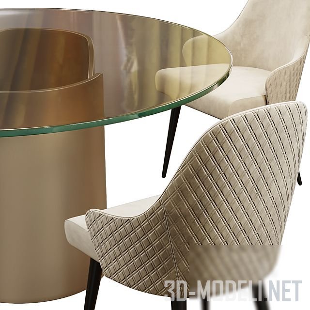 Набор мебели от компании Reflex. В комплекте стол и кресло. Обеденный стол с основанием из экстрапрозрачного гнутого стекла с внутренней отделкой под бронзу, коллекция Petalo, дизайн Tulchinsky. Столешница предлагается из стекла, экстрапрозрачного стекла, MarmoReflex или LegnoReflex, из дерева в отделке под бронзу или орех (Canaletto или Canaletto Henne).