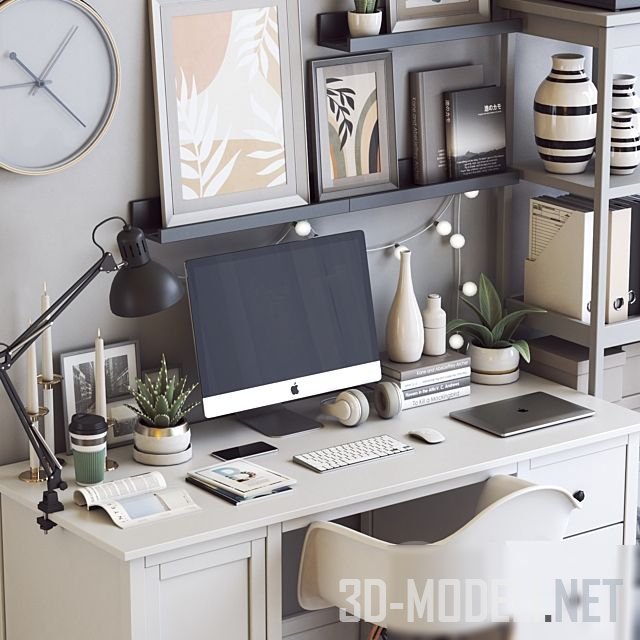 Набор мебели и декора в современном стиле от бренда IKEA. В комплекте рабочее место для дома и офиса, которое формируют следующие предметы мебели и декора: белый стол ХЕМНЕС (155 x 65 см), стул Vitra Eames DAW, также белого цвета, стеллаж ХЕМНЕС (серый, размер 42 x 172 см), черного цвета полка для картин MOSSLANDA, 55 см, рабочая лампа TERTIAL темно-серый, настенные часы ROTBLOTA, отделка шпон ясеня/светло-серый, размер 42 см, а также MANICK (коробка с крышкой, черная, размер 25 x 35 x 20 см).