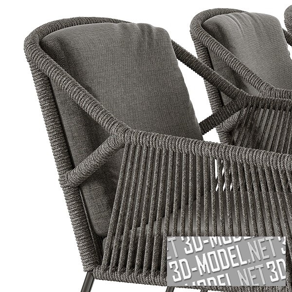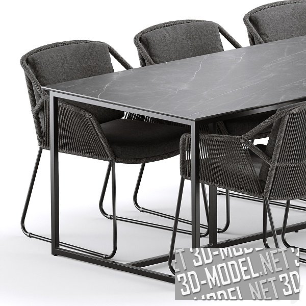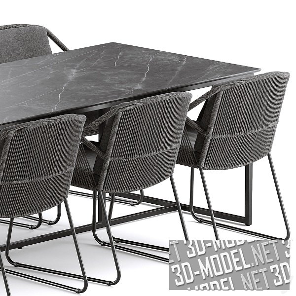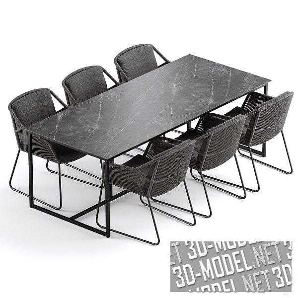 Прямоугольный обеденный стол и шесть кресел для использования на открытом пространстве. Металлические каркасы кресел красиво оплетены синтетическим волокном серого цвета, в тон непромокаемой обивки мягких элементов сиденья и спинки. Ножки кресел черные. Плоская столешница декорирована под черный с белыми прожилками мрамор смонтирована на черном металлическом каркасе.