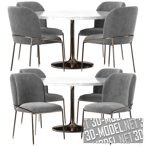 Набор современной мебели для обеденной зоны. Сет содержит круглый стол Nero 48 от бренда Crate & Barrel и стул Astrud от West elm. Столешница стола из белого мрамора идеально сочетается с обивкой стула, и формирует элегантный и стильный комплект для столовой, кухни или кафе.