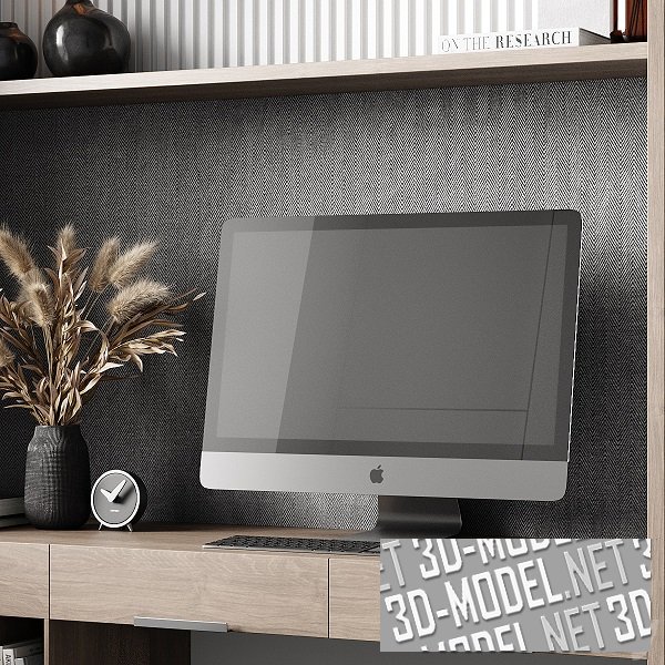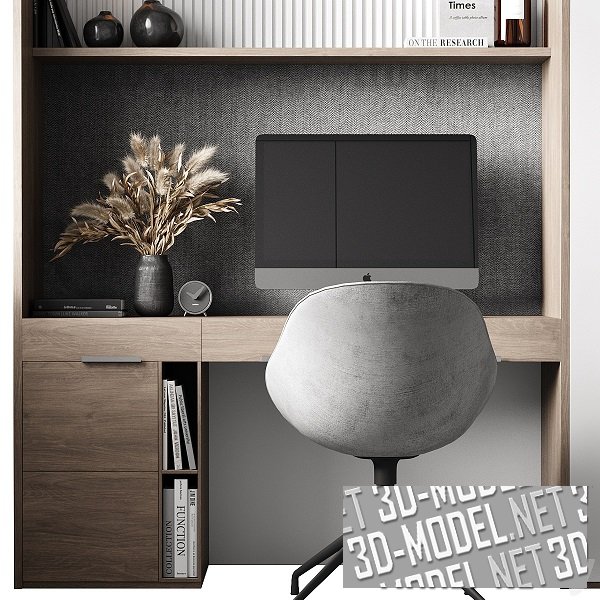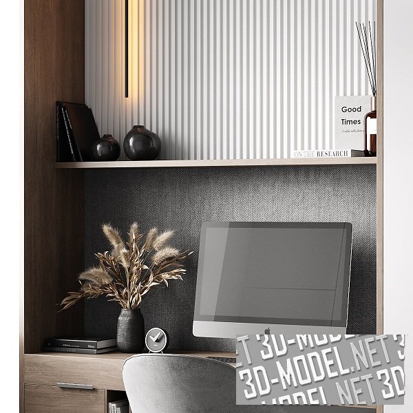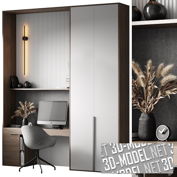 Набор современной мебели для оборудования рабочего места в современном интерьере. Высокий двухстворчатый шкаф, письменный однотумбовый стол, книжная полка - изготовлены из плит с текстурой дерева цвета орех и плит серебристого цвета. Стена над полкой декорирована серебристой гофрированной панелью. На ней - современный настенный светильник в минималистичном стиле, с контр-ажурной подсветкой. Небольшое серое кресло у стола, монитор, черная ваза с сухими травами, книги, керамика, небольшие часы со стрелками - в черно-серых тонах.