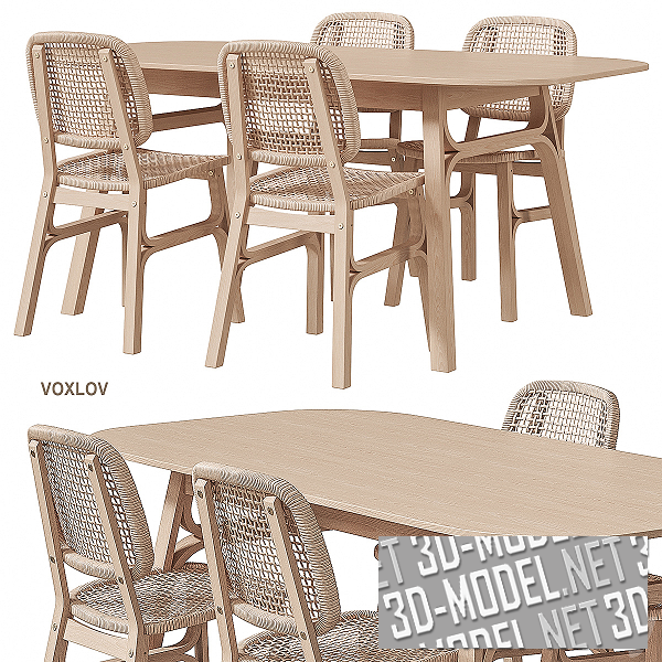 Набор легкой обеденной мебели с универсальным, натуральным дизайном. Производитель: IKEA. Серия VOXLOV. В комплекте обеденный стол (размер 75 х 90 х 180 см) и стул с сетчатой спинкой. Размер стула: 85 х 43 х 53 см.