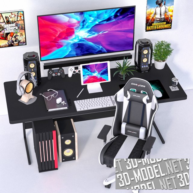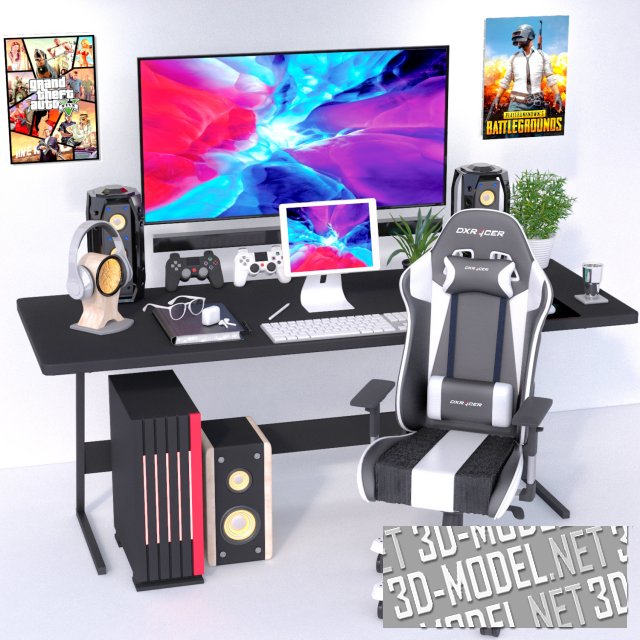 Современное оборудование и мебель для комнаты геймера. В комплекте удобное кресло, компьютер с мониторами, наушники, другие девайсы. На стене постеры, один из самых узнаваемых – GTA.