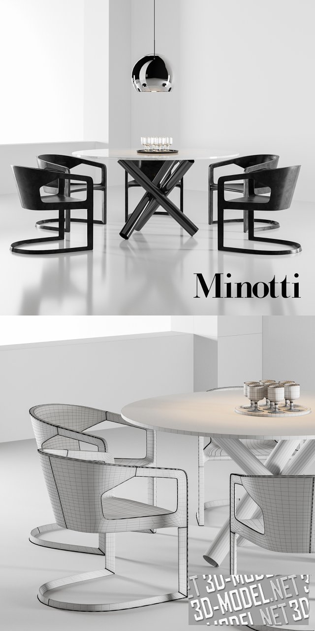 Современные обеденные столы, полукресла, стулья и подвесные светильники над столами от Minotti. Комплекты выглядят очень гармонично. Все компоненты подобраны в одном стиле. Столы с толстой стеклянной столешницей (представлены прямоугольный и круглый столы) и опорами из хромированных толстых труб, соединенных по типу противотанковых «ежей», перекликается с глянцевыми зеркальными поверхностями шаровидных плафонов светильников над столом. Стулья и полукресла с подлокотниками объединены общими формами, конструкцией полукруглых баз, темным цветом отделки. На столе - поднос с прозрачными стеклянными бокалами.