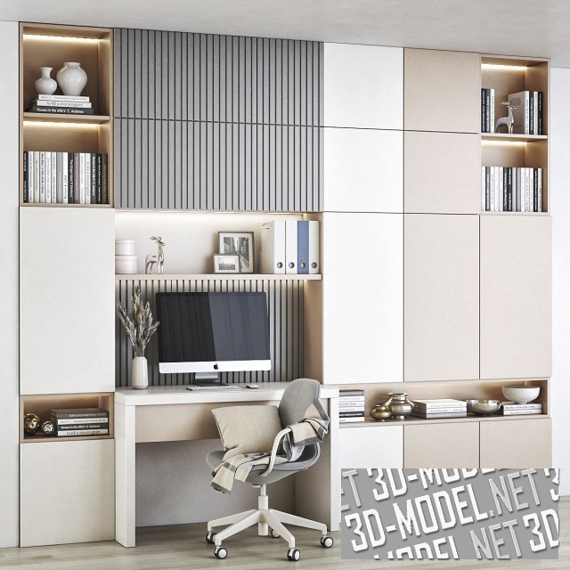 Современная мебельная стенка с гладкими фасадами белого и светло-бежевого цвета. Между фасадами есть ниша, в которой размещены: полка с декором, рабочий стол с вазочкой, клавиатурой и большим монитором. Фасады верхних полок над рабочим местом и стенка в нише за компьютером серого цвета и декорированы фрезерованными вертикальными канавками. Возле стола находится офисный стул LANGFJALL серого цвета с белыми подлокотниками и крестовиной. На нем плед и декоративная подушка.