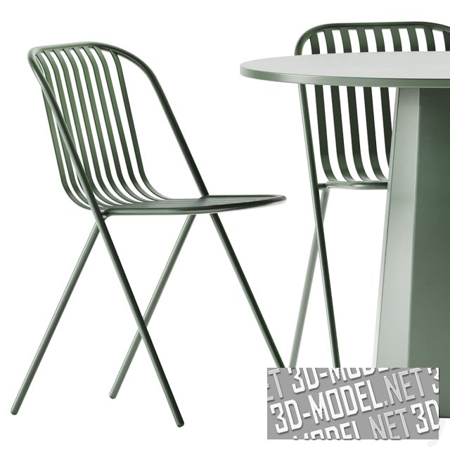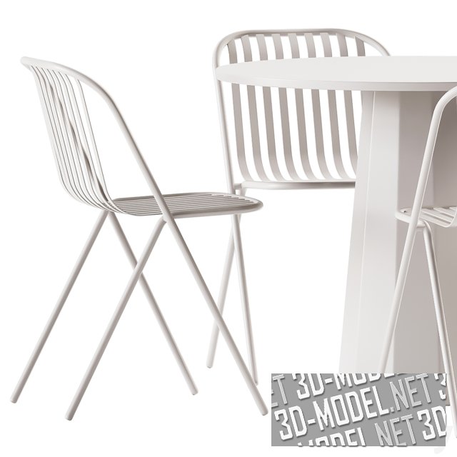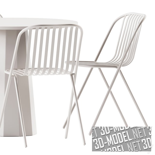 Комплект итальянской садовой мебели для интерьера в стиле лофт или конструктивизм. Стол Dix от Connubia имеет металлическое десятигранное основание конической формы и круглую столешницу из ламината HPL. Его размеры: 90 x 75 h см. Сиденье и спинка стула Belca от TUBY Garden furniture выполнены из изогнутых стальных пластин, а две стальные трубки диаметром 20 мм очерчивают периметр, пересекаясь в двух точках соприкосновения. Размеры: 50,5 x 51,5 x 79 см. В сцене представлены два варианта цвета мебели оливковый и белый.