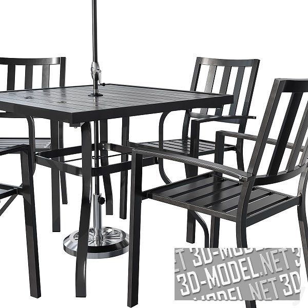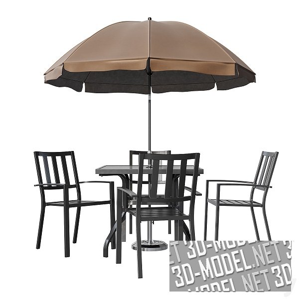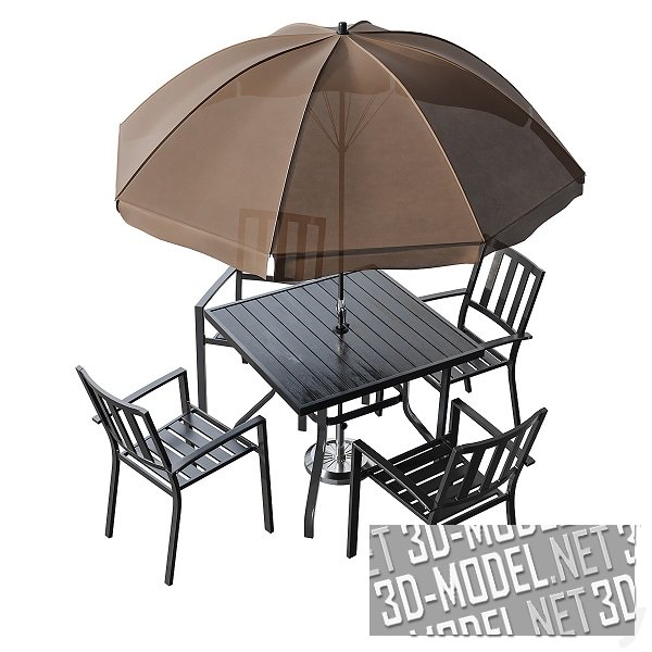 Комплект современной мебели для летнего кафе, террасы, дачи. В центр квадратного стола интегрирован уличный зонт с тканевым куполом коричневого цвета и круглой металлической основой. Вокруг стола стоят четыре стула. Плоскости сидений стульев, спинки и столешница набраны из темных планок.