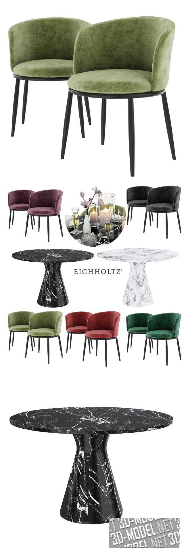 Красивый круглый стол EICHHOLTZ Turner из искусственного мрамора черного цвета с белыми прожилками. На столе ветка с розовыми цветами в вазе, глубокие и мелкие тарелки, салфетки, бокалы и столовые приборы. Размеры стола: 119,5 x H. 75 см. В наборе мягкие стулья светло-зеленого  цвета с черными ножками. В сцене предоставлены еще несколько вариантов расцветки обивки стульев: камерон королевский пурпурный, камерон винно-красный, камерон светло-зеленый, камерон черный.