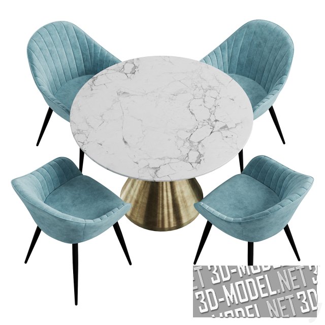 Красивый мебельный сет, состоящий из обеденного стола Silhouette от West elm и четырех стульев Herbert от фабрики La Forma. Стол высотой 76 см, имеет красивую круглую столешницу из светлого мрамора диаметром 110 см на конусообразной ножке из металла цвета полированной латуни. У стульев спинка с вертикальной амортизацией и сиденье с подушкой обтянуты голубой мягкой велюровой обивкой. Черные металлические ножки имеют конусную форму. Их высота 46 см. На каждой ножке пластиковые накладки.