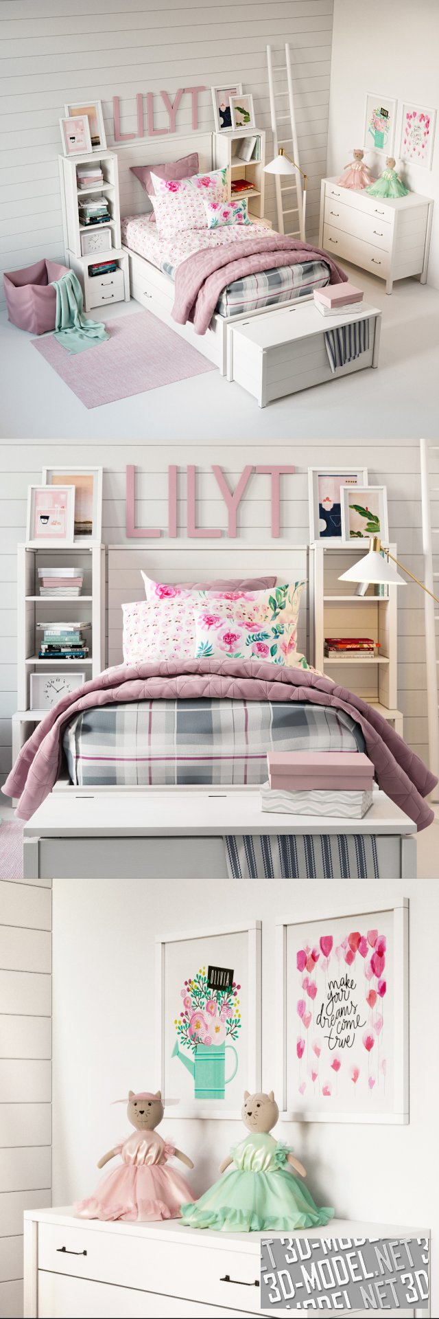 В наборе высокая кровать Grayson с местами хранения под толстым клетчатым матрасом, с изголовьем, с книжными полками по бокам и прикроватными тумбочками, комод Grayson с тремя широкими выдвижными ящиками, сундук-скамья в изножье кровати, белая лестница, набор стеганого постельного белья в светлых тонах, мягкие кукольные кошки в пышных платьях на комоде, настенные панно от Minted в белых рамках, розовый коврик Peyton, корзина для белья, торшер с белым рефлектором и золотистыми элементами на ножке с регулировкой наклона абажура, розовая надпись «LILYT» из букв над изголовьем, а также книги, фоторамки, часы.