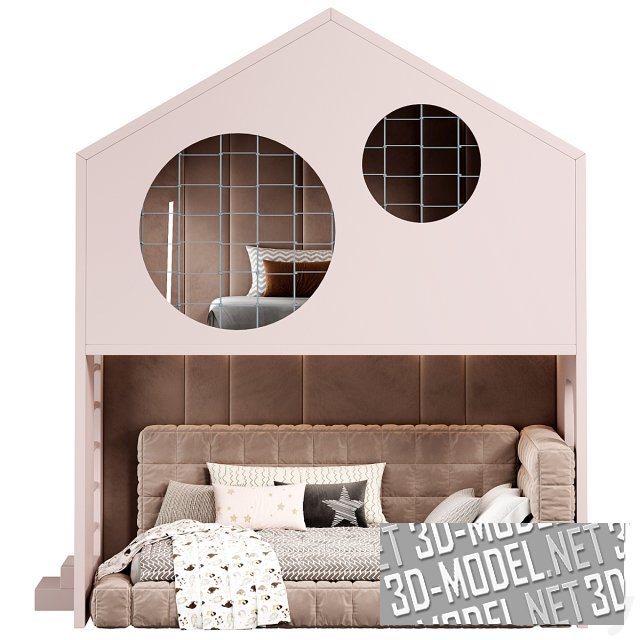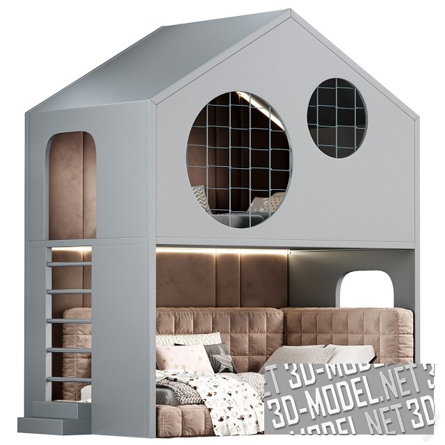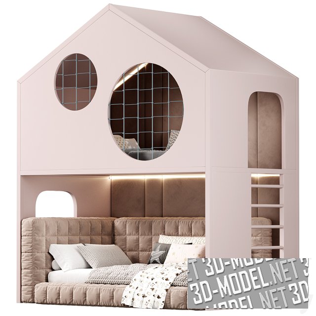 Функциональный детский комплект в трех вариантах цветовой отделки - розовый, бежевый и серый. Два яруса со спальными местами оформлены в виде домика, что создает игровой элемент в пространстве комнаты. Мебель оборудована подсветкой, дополнена постельными принадлежностями. Все эти детали делают трехмерную модель очень реалистичной.