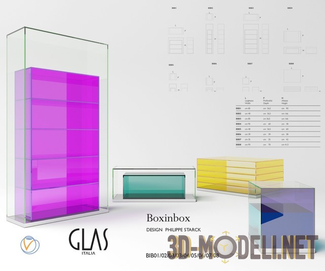 3d-модель коллекции мебели «BoxinBox» от Philippe Starck, разработана для GlassItalia. Филипп Старк разработал ряд низких столиков, а также закрытые и открытые системы для хранения. Разработанные, как коробка в коробке, объекты сделаны из термо-сварного сверхлегкого стекла, что размещено на базе отражающей полированной нержавеющей стали. Пространство внутри прозрачного стеклянного блока позволяет использовать второй элемент с функцией хранения, а варианты отделки доступны самые разные: прозрачное цветное стекло может быть оранжевым, светло-серым или желтым, как солнце. Стильная мебель, отличная модель, которая сохранена в формате 3ds max 2012, 2014 + fbx.
