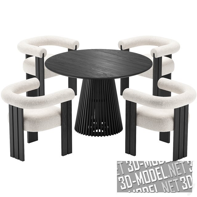 Современный стул с мягким сидением Percy от компании Eichholtz и круглый стол Irune от La Forma представляют собой отличный набор мебели для обеденной зоны. Сочетание черного дерева и белой тканевой обивки смотрится по-особенному, создавая необычный образ. Этот набор мебели можно легко сочетать с различным декором и отделкой интерьера.