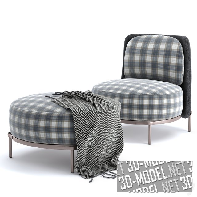 Представлены четыре варианта обивки сиденья и подушки спинки (основание спинки во всех вариантах - темно-серое): тонкая серо-синяя клетка на сером фоне, толстая серо-синяя клетка на белом фоне, серо-оливковый и серый велюр. Плед в черно-белую елочку, небрежно наброшенный на пуф, добавляет уюта в композицию.