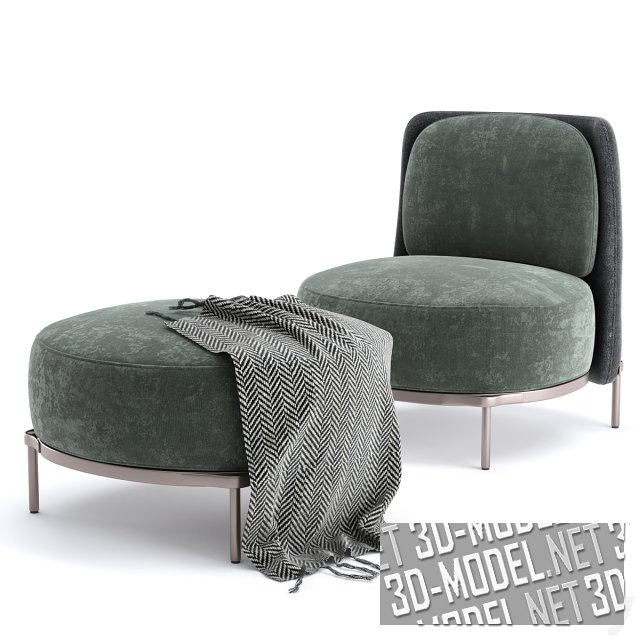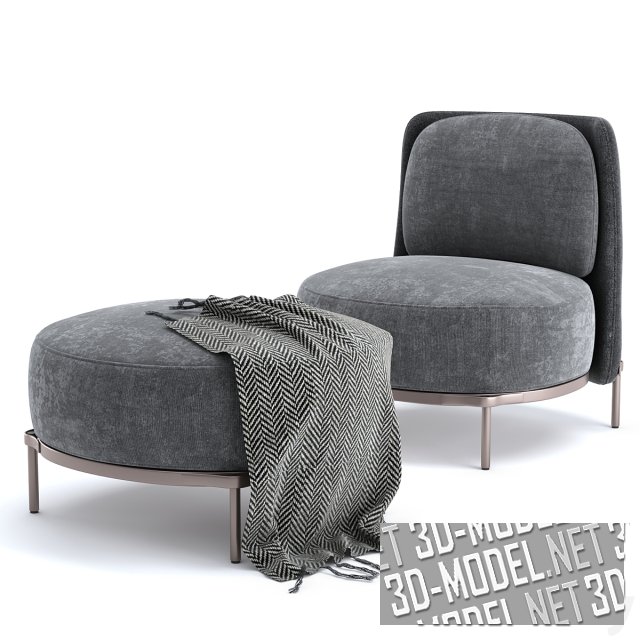 Уютный комплект Tape от Minotti из круглого кресла и круглого пуфика-подставки для ног. Круглая подушка сиденья смонтирована на аккуратном металлическом каркасе на четырех ножках серебристо-бежевого цвета. Кресло состоит из трех мягких элементов на каркасе: круглое сиденье, основание спинки и подушка спинки.