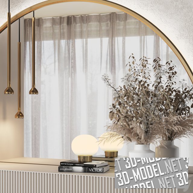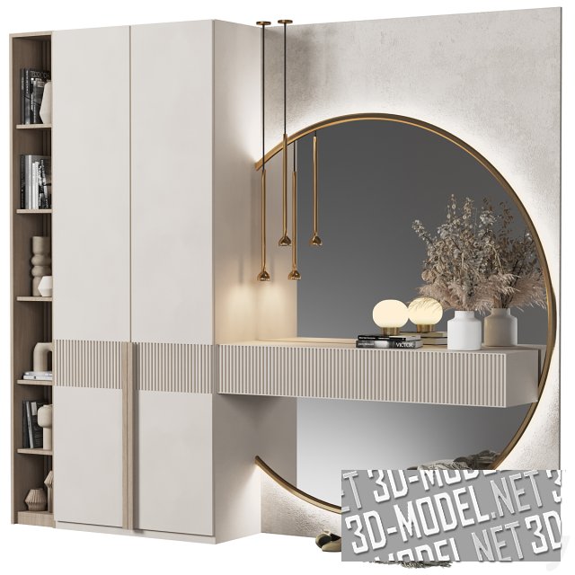 Современный набор мебели и декоративных аксессуаров для прихожей. Состоит из шкафа, стола, пуфа, полок, вазы с сухоцветами, настольного и подвесного светильников, большого круглого зеркала с позолоченной окантовкой. Находящиеся сбоку полки полностью заполнены вазами различной формы и книгами. Мягкий пуф сочетается по цветовой гамме со всей мебельной группой, образуя идеальный комплект. Накинутый плед и рядом женские туфли придают реалистичности общей картине. На столе с рифленой отделкой можно увидеть книги, настольную лампу и белую вазу с букетом сухих цветов. Рифленая полоса продолжается от стола до самого шкафа.