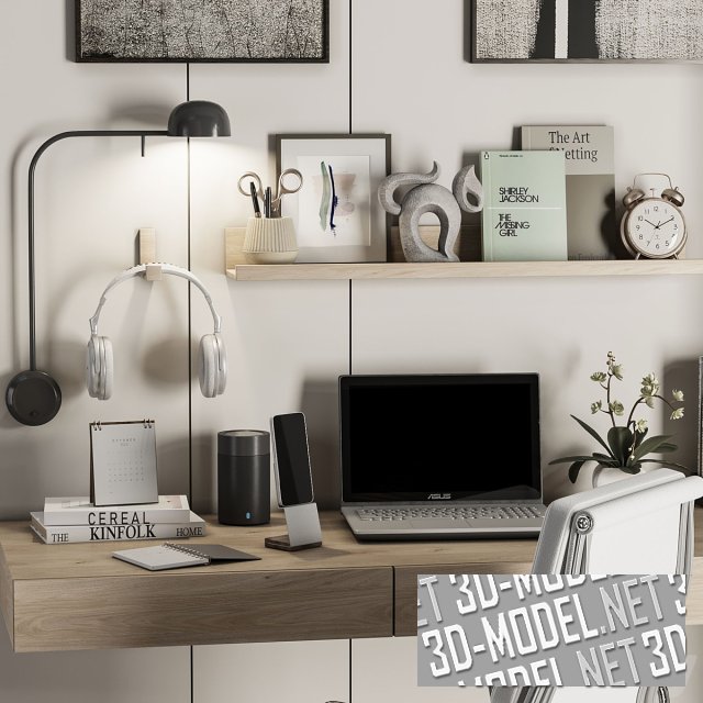 Современное домашнее рабочее место с мебелью в оттенках слоновой кости (стеновые панели) и бледно-фисташкового (шкаф с полками). Небольшой письменный консольный стол с тремя выдвижными ящиками изготовлен из плит с текстурой светлого дерева. Хромированное мобильное кресло оснащено мягким сиденьем и регулируемой мягкой спинкой с белой обивкой. На столе ноутбук, горшок с маленькой орхидеей, книги, блокноты. На стене полка с книгами, часами, фигуркой кошки, фоторамкой; светильник на подвижном кронштейне, наушники на вешалке, пара абстрактных монохромных панно в тонких черных рамках. На полках со скрытой подсветкой: книги, керамика, настольные статуэтки из металла в виде колосьев. Под столом - белая корзина для бумаг с крышкой.