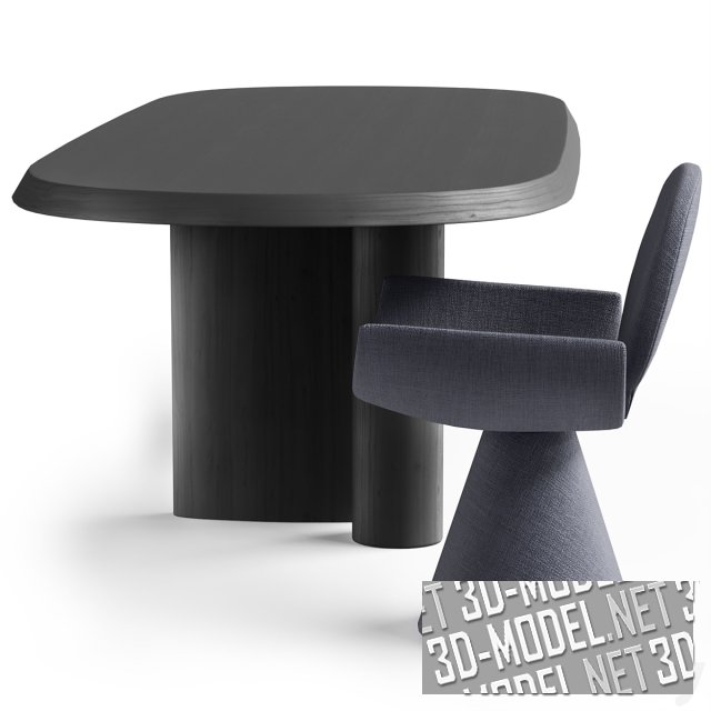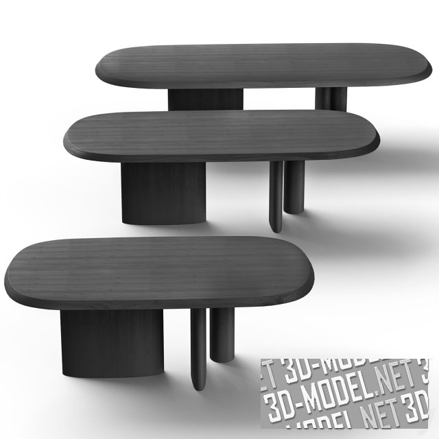 Габарит стола представлен тремя типоразмерами: 200х104х76см, 250х108х76см и 300х118х76см. Три опоры стола выполнены в виде элементов круглого и овального сечения, асимметрично размещенных под толстой столешницей со скошенной (фацетированной) кромкой.