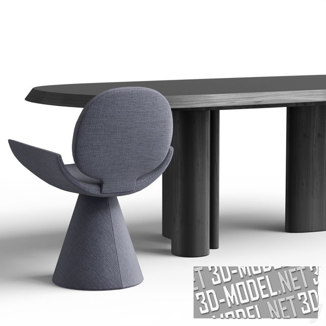 Современный овальный стол Padiglioni с текстурой дерева серого цвета и стул Youpi от BONALDO. Опора кресла выполнена в виде усеченного конуса. На нем закреплено выгнутое сиденье. Аккуратная круглая спинка, сиденье и опора обиты серым текстилем. Габарит стула: 55х58х82см.